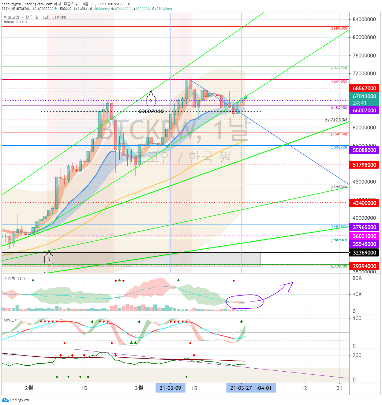 하락한다면, 61712000 -64837000 구간에서 지지를 받는지 지켜봐야 합니다.