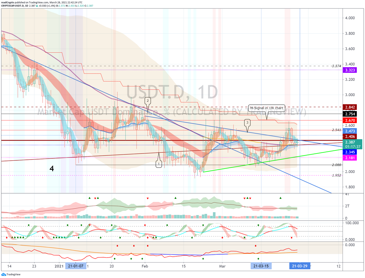 3월 29일경의 변동성으로 2.345-2.406 구간에서 벗어나는 움직임이 나오는지 지켜봐야 합니다.