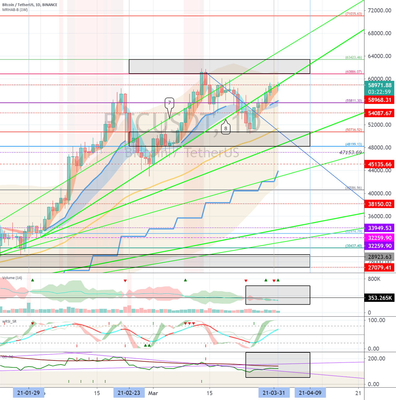 특히, 59029.0 지점 이상 상승하여 지지를 받을 수 있는지 지켜봐야 합니다.