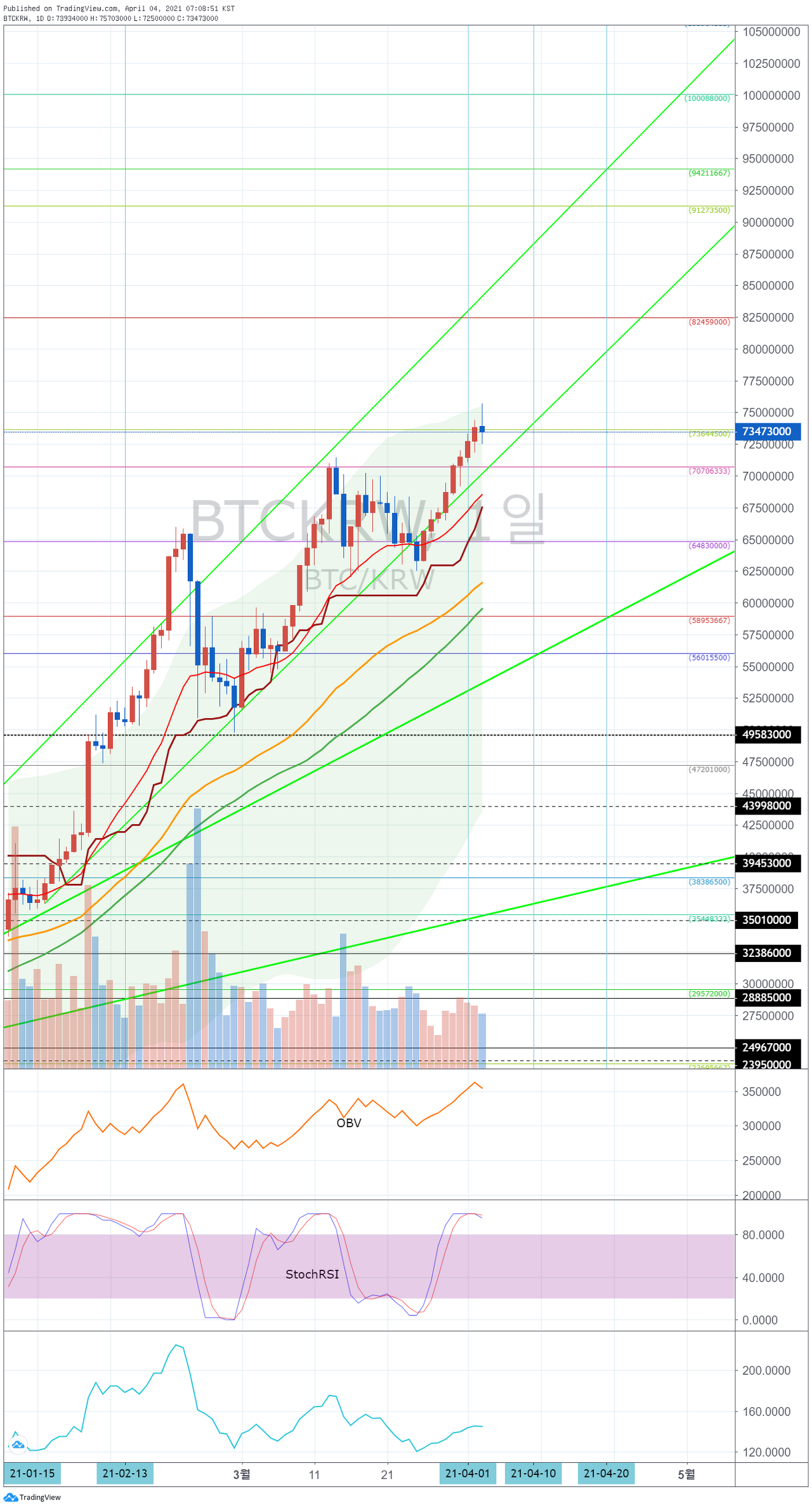 70694000-73622000 구간에서 지지를 받는다면, 새로운 방향을 결정할기 위한 움직임이 나올 것으로 예상됩니다.