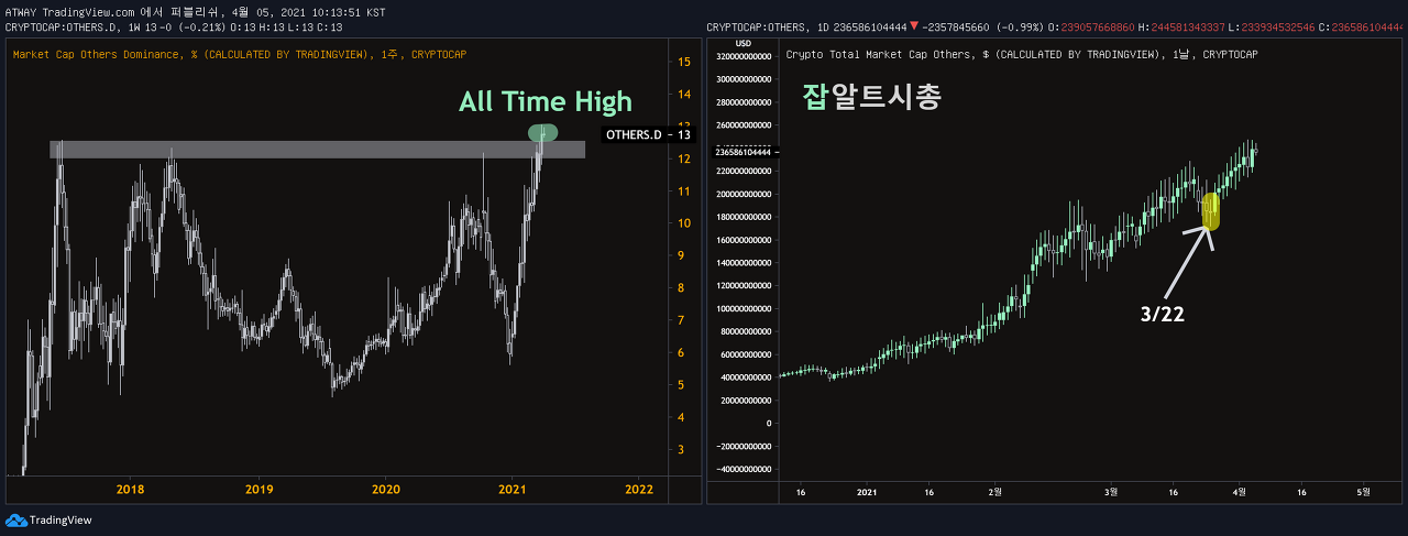 과거 데이터를 참고하였을 때 잡알트 도미넌스의 급격한 증가세는 오히려 위험신호로 받아들여야 합니다.