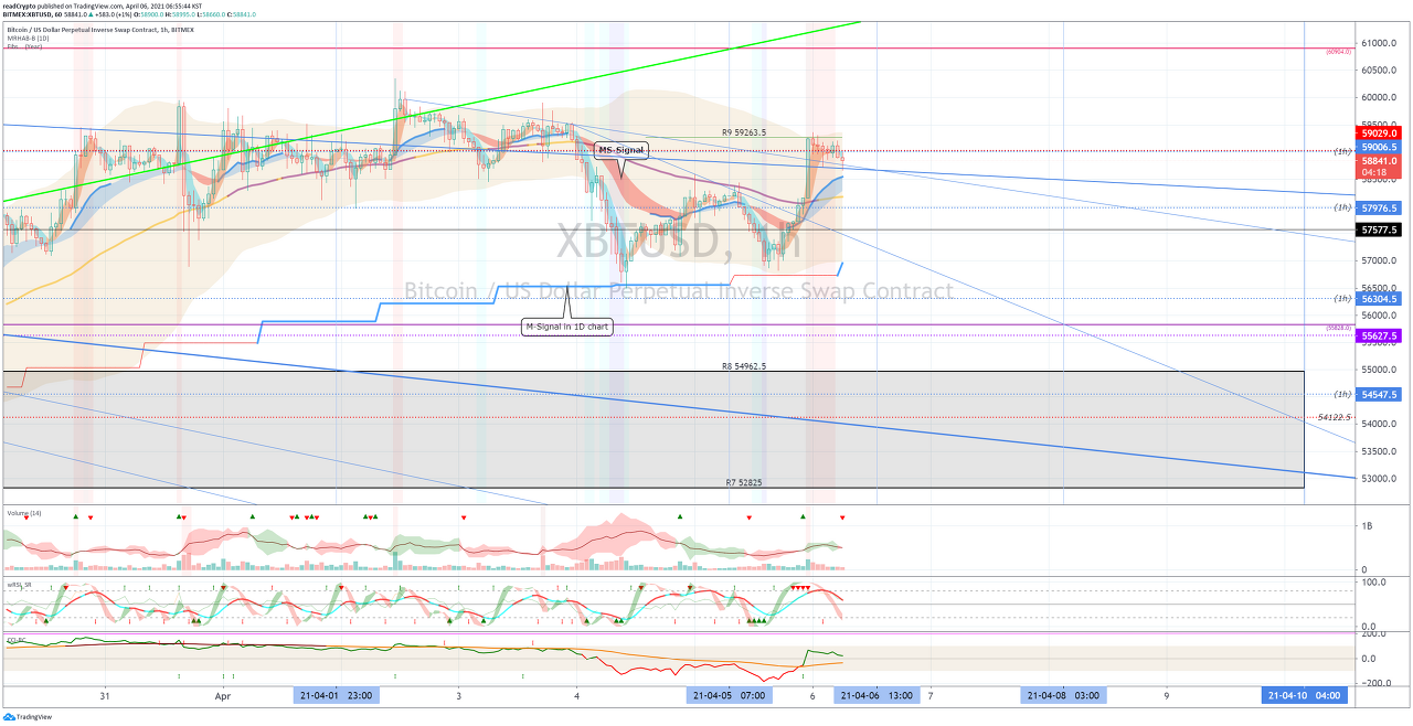 특히, 하락 추세선에서 벗어나서 58968.31 지점으로 상승할 수 있는지 지켜봐야 합니다.