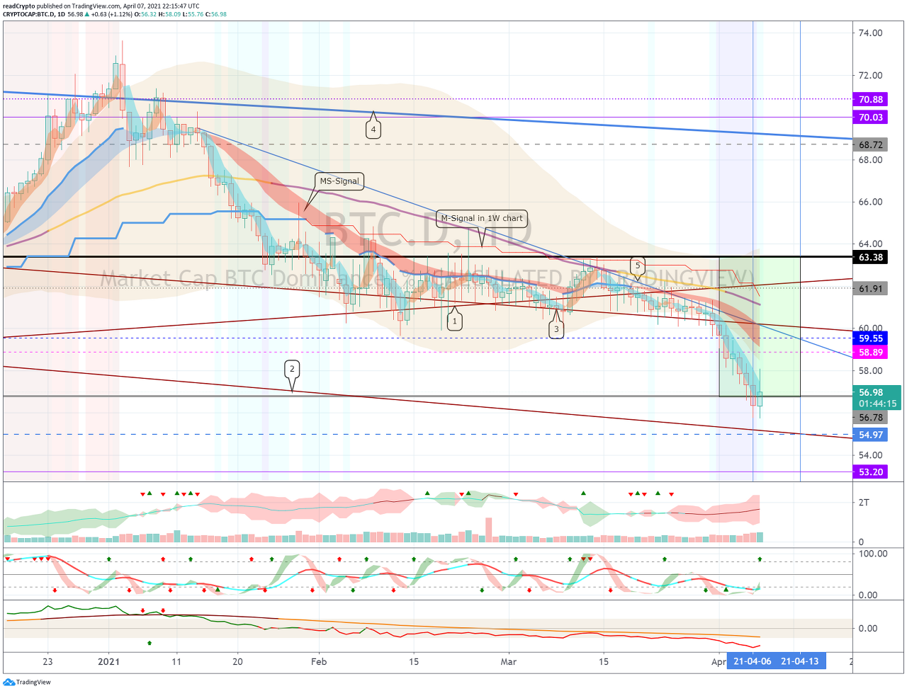 BTC 도미넌스가 중요한 구간인 56.78-68.72 구간에서 벗어나기 위한 시도가 나오고 있습니다.