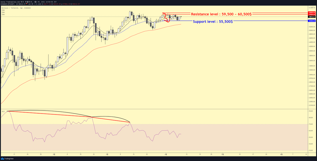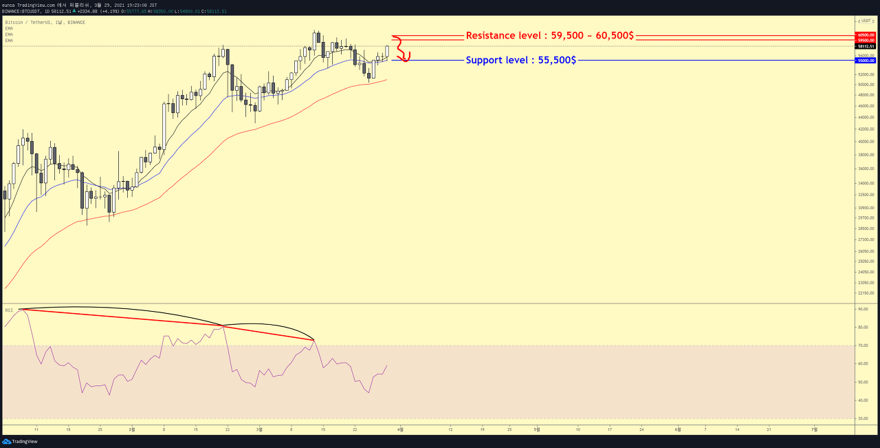 지난주, 주요한 저항레벨을 59,500 ~ 60,500$ 안내드렸으며 해당 저항레벨에서는 '매도'의 포인트로 접근 하실 것을 안내드렸습니다