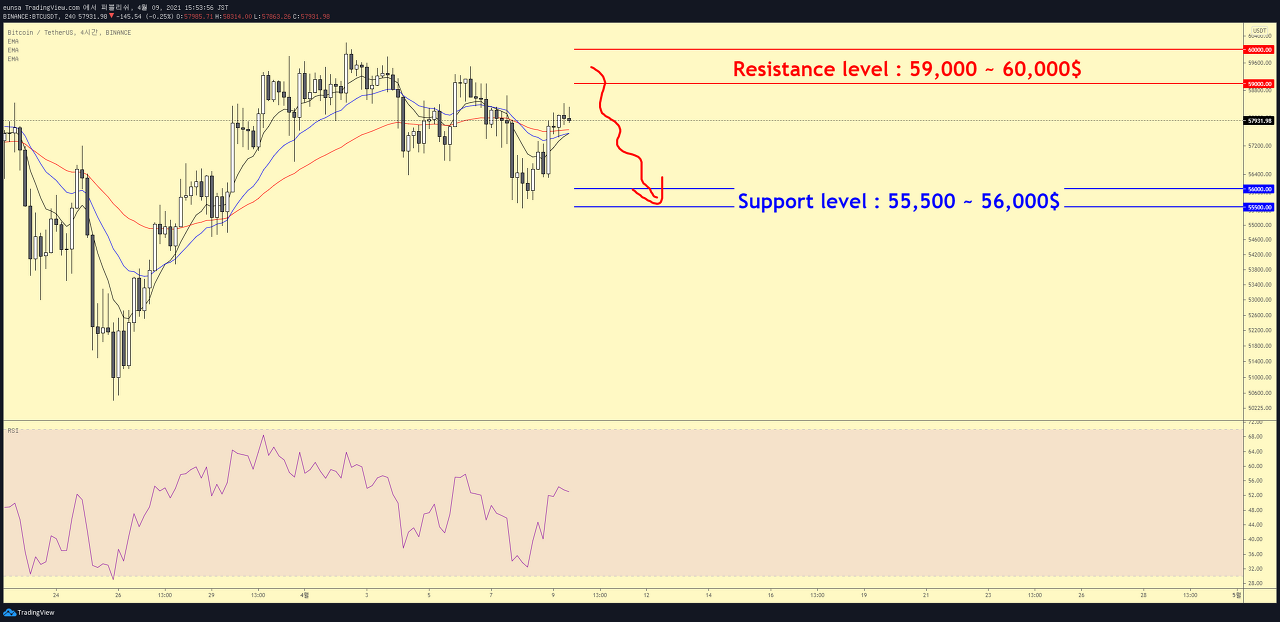 그리고, 주요한 지지레벨을 55,500$부근을 안내드렸으며 해당 가격대에서의 반등여부에 대해 살펴보실 것을 안내드렸습니다