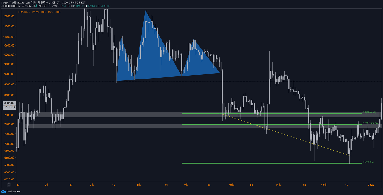 엊그제, 3월 5일자로 역헤드앤숄더의 넥라인이 돌파됨에 따라 상승 목표가를 9500달러로 설정하고 롱포지션 홀딩/신규진입을 하는 전략이 가능해졌습니다.
