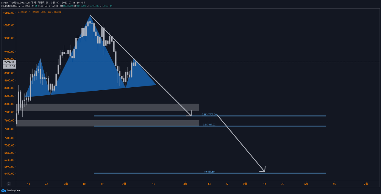 패턴적인 관점에서 논쟁의 여지가 있는 자리입니다. 하방으로 보자면 최대 6400달러 쌍바닥까지 타겟으로 잡을 수 있고, 상방으로 보자면 일단 9500달러를 목표로 둘 수 있습니다. 어느 패턴이 먼저 완성되게 될지 지켜보시면 되겠습니다.