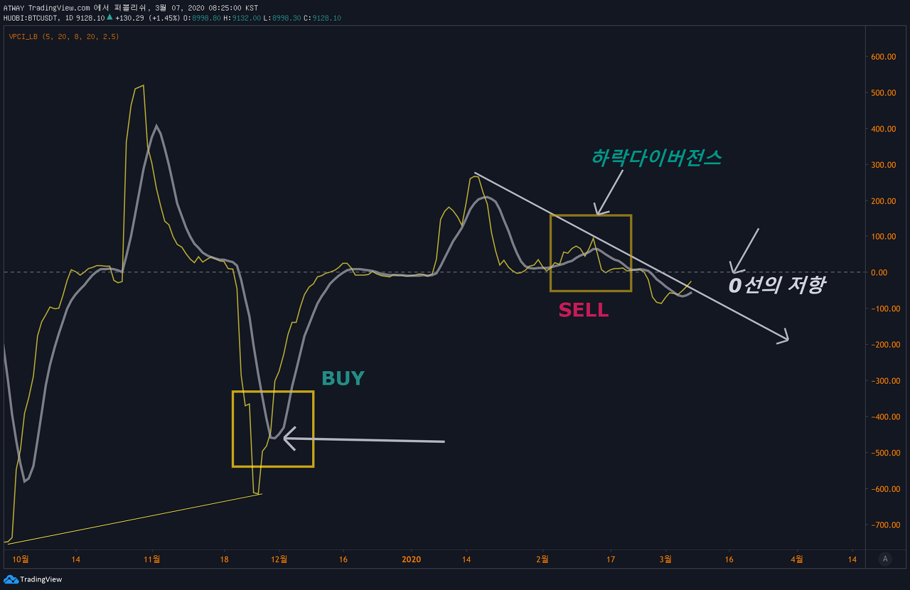하락다이버전스의 출현과 더불어 20%의 하락이 발생하였으며, 그 후로부터의 반등은 큰 볼륨을 동반한 상승이 아니라는 비판적 시각이 존재합니다. 8%가량의 반등이 나온 상태이긴 하지만, VPCI는 하락트렌드 속에 여전히 위치하고 있습니다.