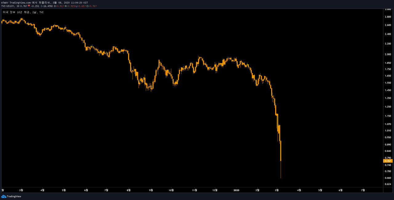 미국 10년 국채 금리입니다. 보시다시피 1월말부터 폭락을 면치 못했습니다.