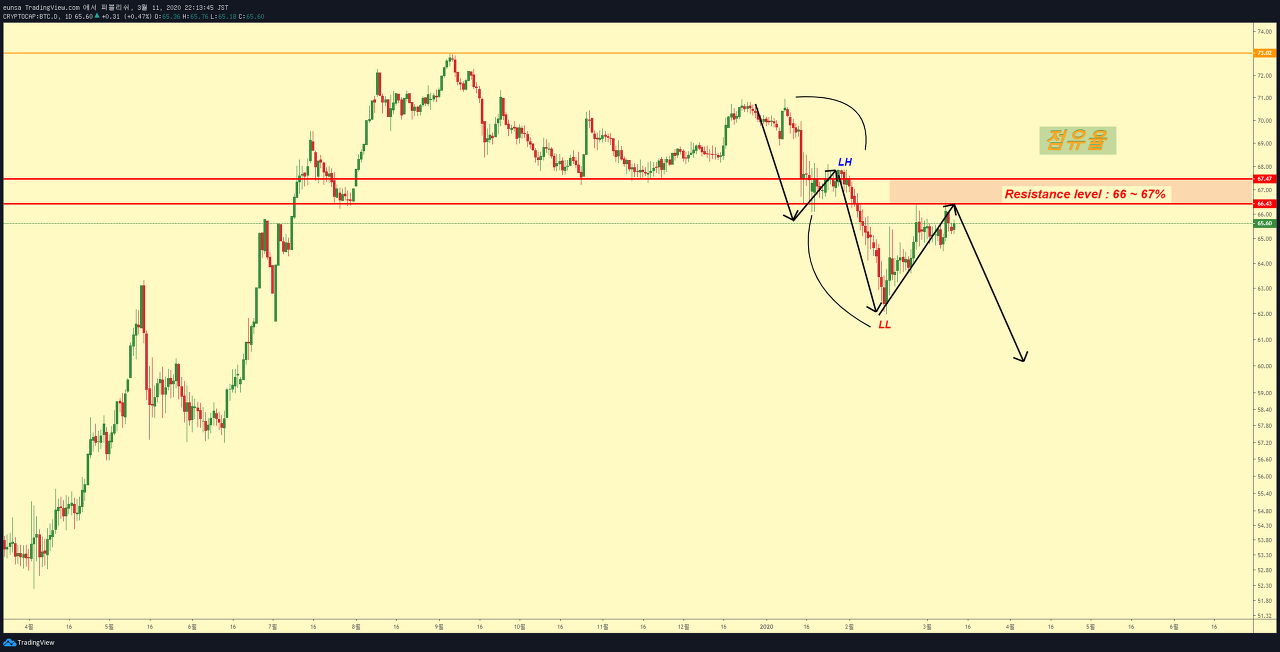 (4) 해당 점유율 차트가, 다우이론을 만족하며 지속적으로 비트코인의 점유율이 하락한다면, 연초에 느꼈던 상승장이 재차 진행되리라 보여집니다