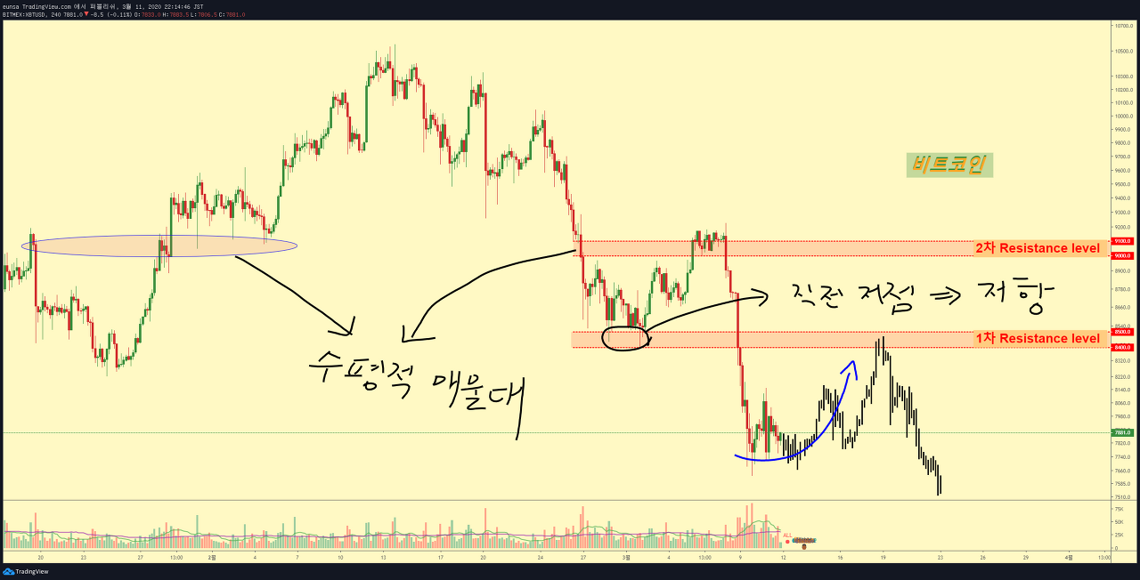 (1) 비트코인이 마지막 휩쏘 및 패닉셀이 나온다고 할지라도, 7k만 무난히 지켜준다면 1차 Resistance level 및 2차 Resistance level까지 상승 할 것이라 보여집니다