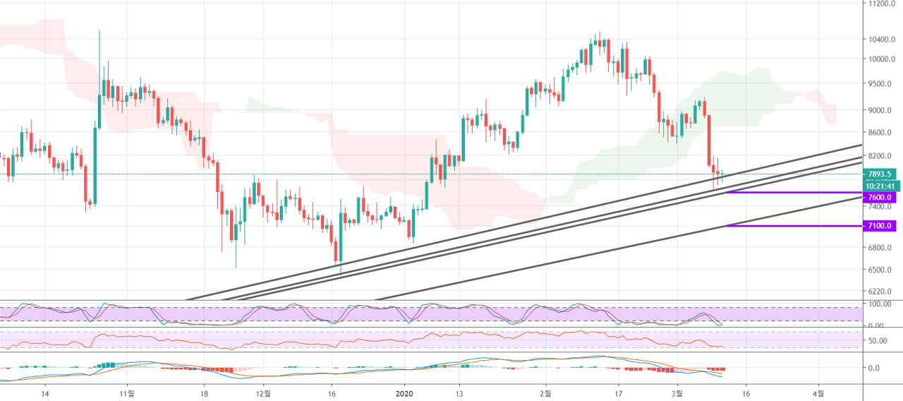 만약 7700 달러가 뚫리면 7300 달러까지 찍고 반등하여 올라올 수 있기를 기대합니다.