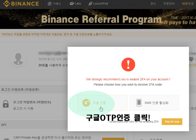 바이낸스 가입 후 로그인하시면 위와 같이 메인페이지에 팝업이 뜨면 '구글인증' 을 클릭합니다.