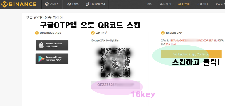 QR코드를 스캔하여 바이낸스계정과 핸드폰과 연동시키는 작업을 해야됩니다.구글 안드로이드,애플 아이폰 할것없이 앱 스토어 가셔서 구글OTP 풀네임인 'google authenticator' 을 치시고 다운로드 받습니다.