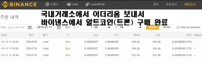 거래가 체결되면 주문내역에 위와 같이 거래내역이 뜨면서 트론이 들어옵니다.