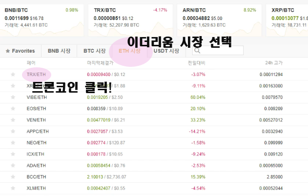 저는 수수료 저렴하고 전송시간 빠른 이더리움을 바이낸스로 전송하였기 때문에 이더리움으로 구매해 보죠.바이낸스 메인페이지 보시면 위와 같이 마켓들이 있습니다.여기서 ETH시장 클릭하시면 이더리움 기반으로 구입하실 수 있는 알트코인 목록이 뜹니다.거래량 순서대로.