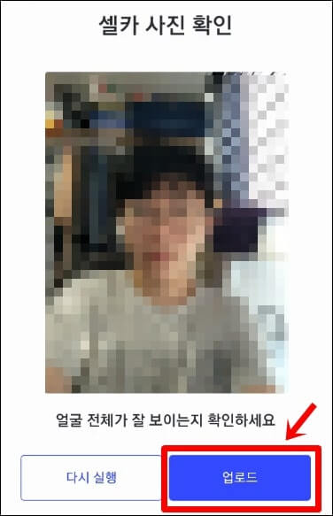 이어서 타원 모양 프레임에 얼굴을 맞춰서 셀카를 촬영한 다음, '업로드' 버튼을 눌러줍니다.