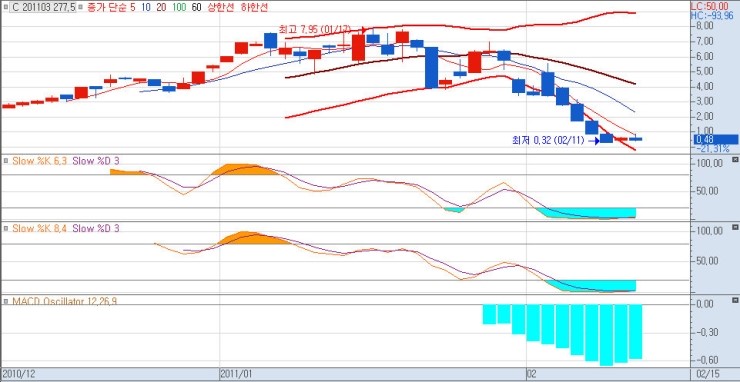 20일이평선 쓰리바닥이 만들어 지면서 지수가 상승하지만 밴드상단을 넘지 못하고 하락하다가 밴드 하단까지 와 있습니다