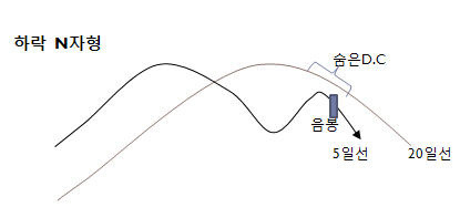 고점에서 주가가 꺽이면서 5일선이 20일선 밑으로 내려온 다음 반등하였으나 20일선을 뚫지 못하고 다시 아래로 내려오면서 역 N자형으로 재하락하는 경우가 하락 N자형입니다 한단계 더 하락 할 가능성이 대단히 높은데 일단 매도하는 것이 안전합니다. 장대 음봉이 나온 시점이 매도시점입니다.