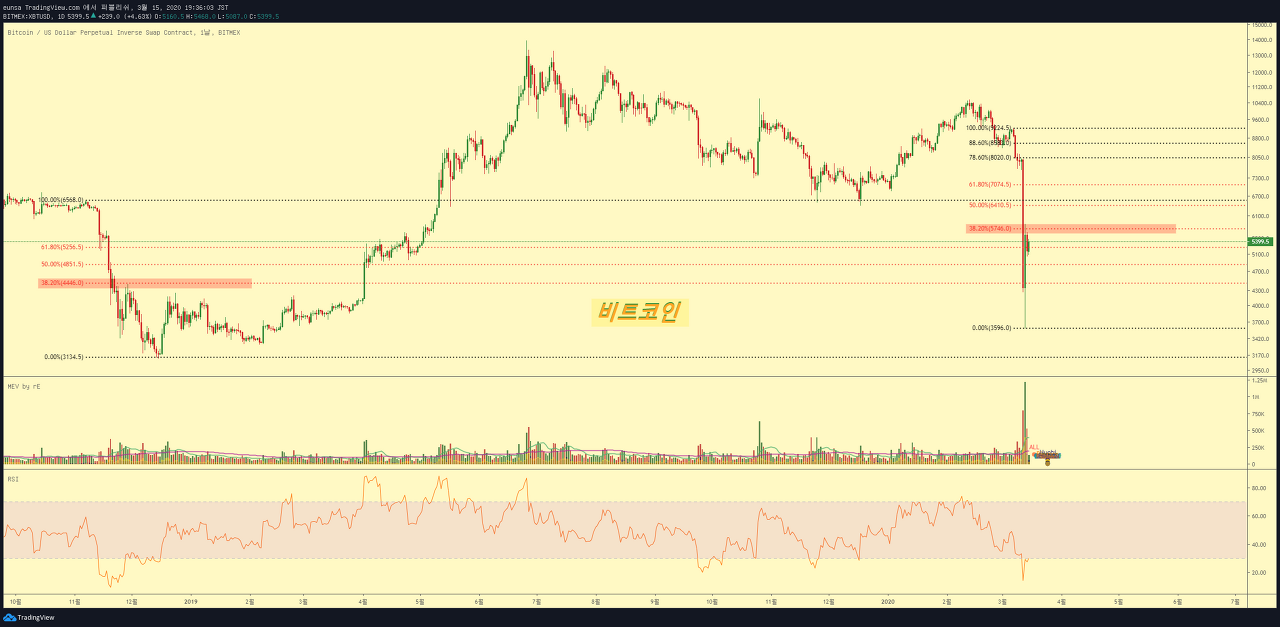 (2) 현재 상대강도지수의 과매도영역이 진행되고 있으며, 작년과 같은 급격한 하락에 따른 되돌림 반등 및 저항레벨을 살펴본다면 Fib-0.382가 될 것이며, 그 값은 5700~5800$ 정도로 형성되어 있습니다