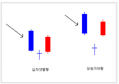- 샛별형과 비슷하나 가운데 십자형이 출현하면 좀 더 강한 상승추세 전환 의미