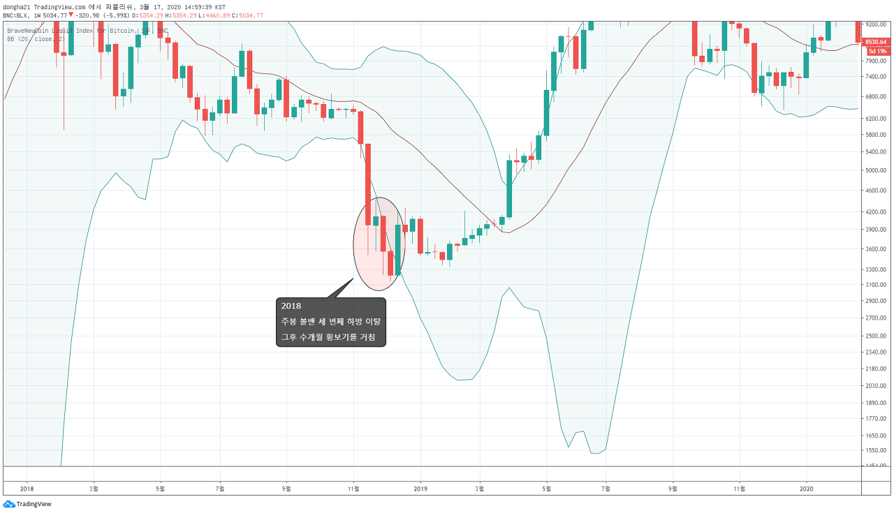 주봉 볼밴 하방 이탈이 발생한 경우는 비트코인 탄생 이래 4회가 전부입니다