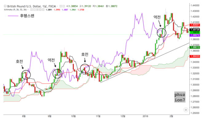 우행스팬은 위 이미지상 보라색 선으로 26일 전의 위치에 현재의 주가를 표기한 선으로 후행스팬이 주가를 밑에서 위로 상향 돌파하면 이를 상승추세로 보고 매수신호로 생각,반대로 후행스팬이 주가 주가를 아래로 뚫고 내려가면 하락추세로 보고 매도신호로 생각합니다.(원리는 골든크로스,데스크로스 개념과 유사)
