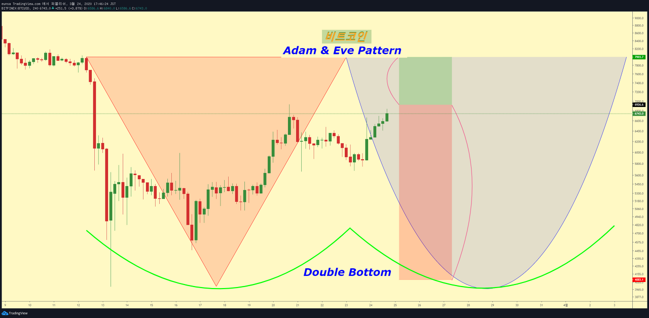 쌍바닥은 결국, Adam & Eve의 Pattern으로 이어 질 것이며 현재의 급격한 상승과 하락은 Adam의 영역으로 기울기가 급한 급강세를 보여주는 것으로 추정합니다