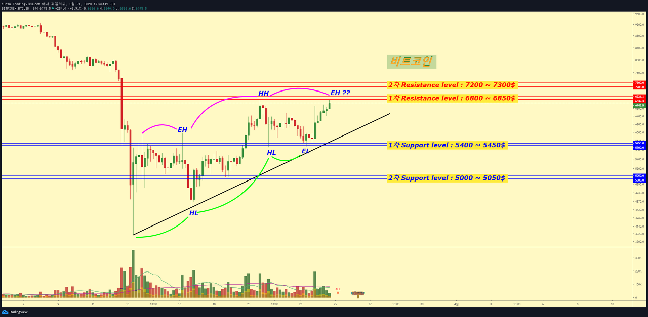 이번에 추가적인 고점을 높이는, 신규 Higher High 파동을 만들어내지 못한다면 단기 상승추세는 종료 될 것이며, 2차 Support level인 5000~5050$ 하락할 가능성을 염두하는게 좋겠습니다