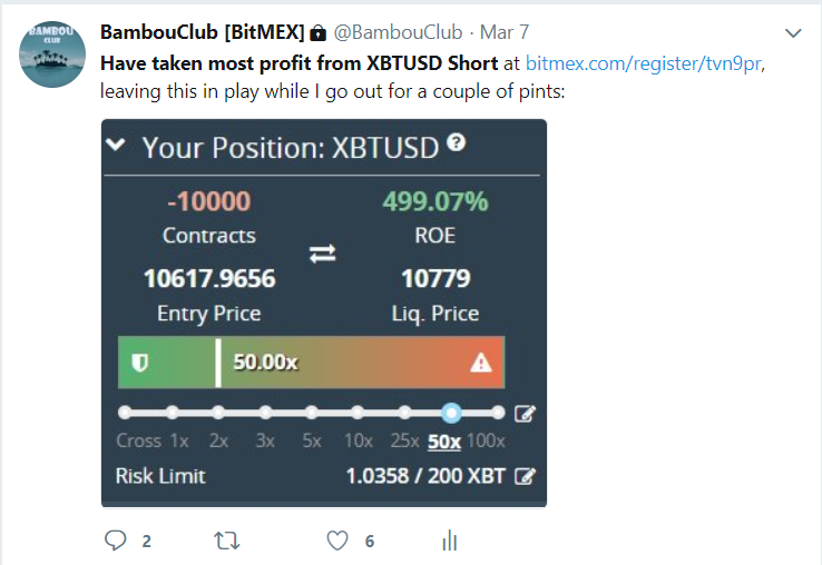 When trading on leverage you do of course need to keep a close eye on the market. Rather than staying glued to BitMex all day, the Twitter account @COINGOSU is useful for keeping an eye on the market.