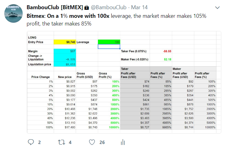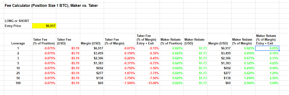 Note that fees for market orders have a massive effect on the costs of trading at high leverage, less so at low leverage. Use Limit orders!