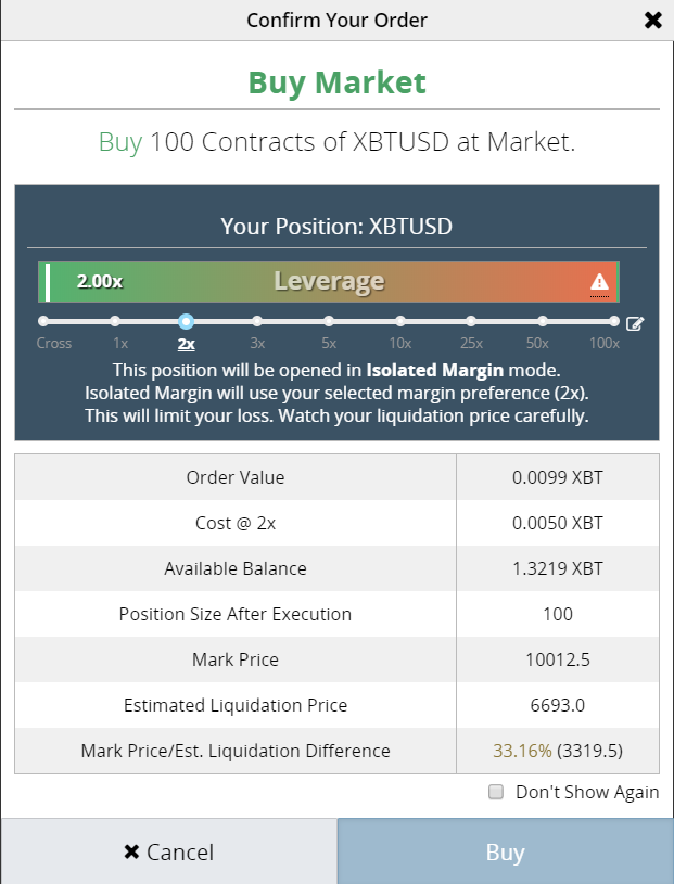 - Set the leverage at 2x, 3x or a maximum 5x using the Leverage Slider Bar. n.b. Do not select Cross on the Leverage Slider Bar. This exposes your whole equity balance and is risky.