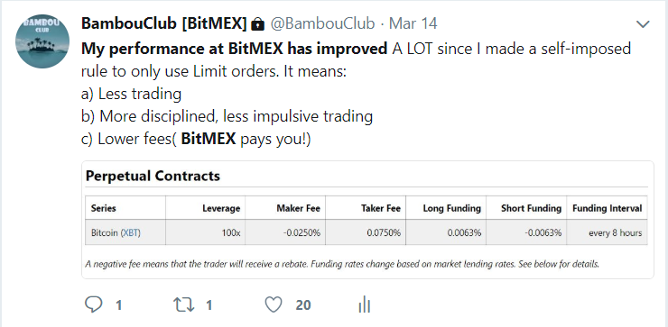 Fees are 15% of your $1,000 trade in the example. Why pay 15% for market trading when BitMEX pays you 5% for trading with Limit Orders? (An additional benefit of Limit trading is that your trading is likely to be less frequent and more disciplined and profitable.)