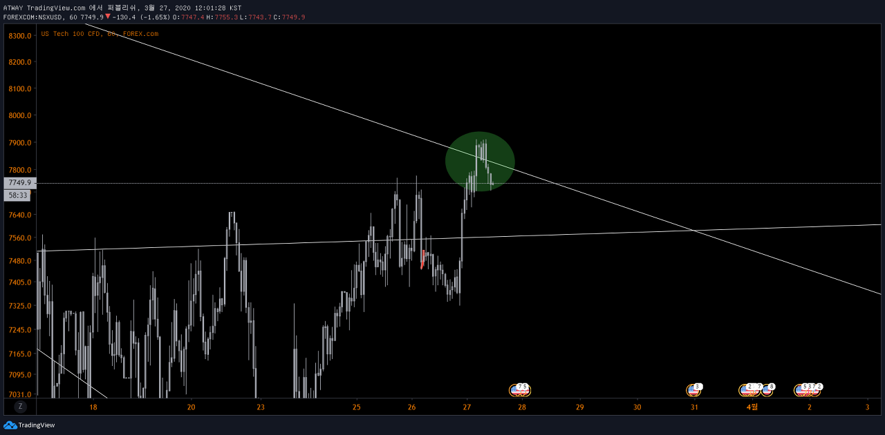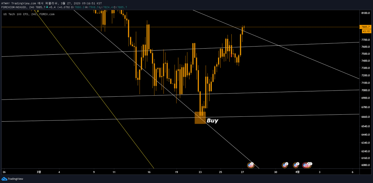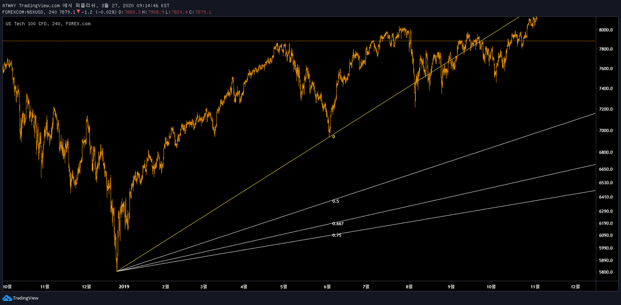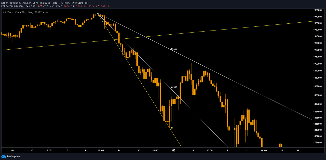 최근 비트코인이 미 증시를 추종하는 경향성을 보이고 있기 때문에 나스닥 추세에 대한 인지가 필요한 상황입니다. 특히 나스닥 기술주들이 가장 큰 변수로 작용하고 있기에 US TECH 100 CFD 를 한번 피보나치팬으로 살펴보겠습니다.
