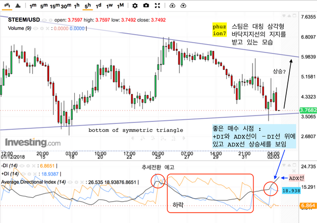 오늘 2월 3일 STEEM 5시간 차트이다 스팀 가격은 대칭 삼각형의 바닥 부근에서 거래되고 있다 오늘 DMI 지표는 사승비율(+DI)가 18.938로 하락비율(﹣DI) 6.864를 상회하고 있으며 ADX선 역시 상승세를 보이고 있다 이것은 좋은 매수 시점임을 의미한다 앞서 1월 25일 0:00에 ADX 선이 하락하며 추세전환을 알렸고 +DI선이 ﹣DI선을 하향 돌파하며 매도신호를 보였다