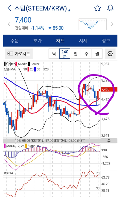 보시면 빨간색 20이평선이 파란색 60이평선을 뚫고 올라서면서 20이평선 위로 양봉이 형성된거 보이시죠? 이때가 바로 최적의 매수 타이밍입니다.