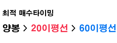 보시면 빨간색 20이평선이 파란색 60이평선을 뚫고 올라서면서 20이평선 위로 양봉이 형성된거 보이시죠? 이때가 바로 최적의 매수 타이밍입니다.