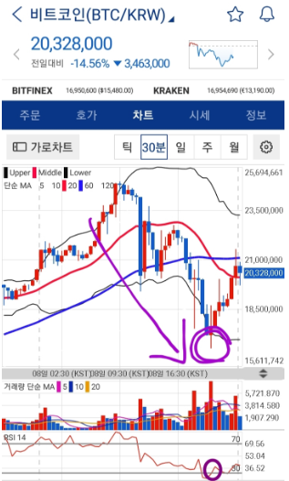 그 중에서도 위 차트와 같이 RSI 지표 30 이하를 과매도 구간이라 하며,가장 이상적인 진입시점은 RSI 지표 30이하에서 위로 솟는 타이밍이 가장 좋습니다.