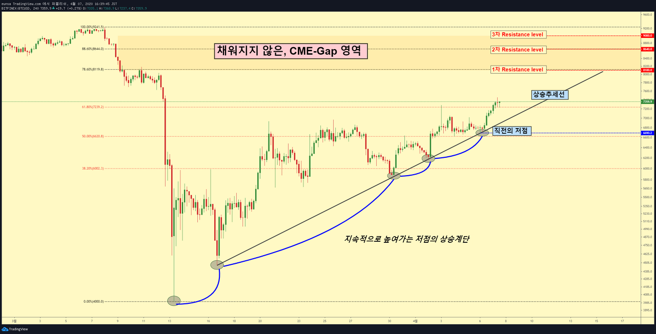 따라서, 상승추세선과 직전의 저점을 하방 이탈하지 않는다면 채워지지 않은 CME Gap을 메꿀 것으로 판단하며, 8100$, 8640$, 9000$을 라운드형태로 천천히 채워 나갈 것으로 전망됩니다