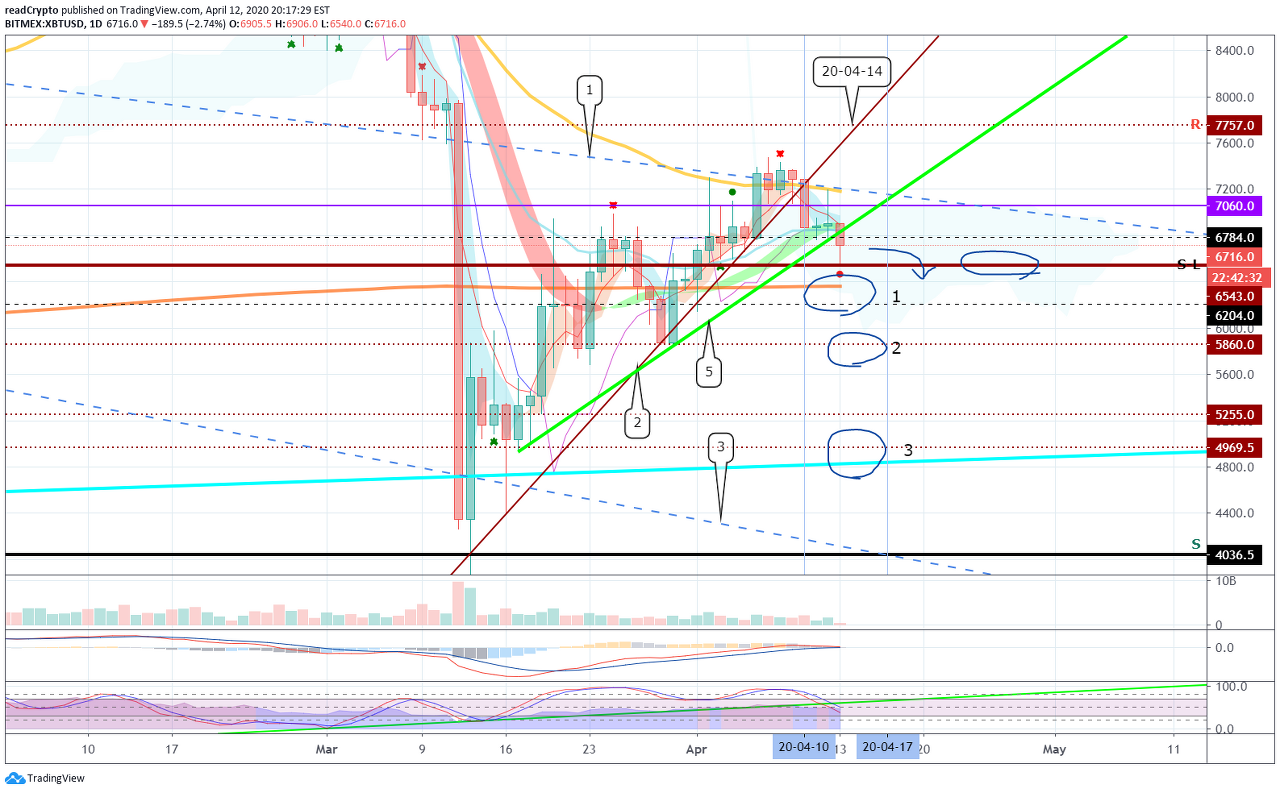 6543 지점 이하로 하락하게 된다면, 1차 구간(6204~1K EMA)에서 반드시 지지를 받아야 합니다.