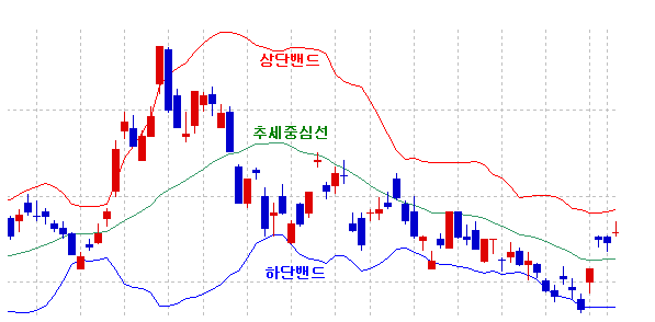 주가의 과거 추세를 밴드(band)로 도식화하여 앞으로 주가흐름을 예측하는게 시용하는 보조지표입니다.