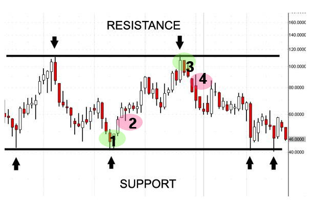시장은 한번 지지선,저항선이 잡히면 그안에서 움직이려는 성향이 있으며,이를 박스권 장세라고도 합니다.이때 취할수있는 가장 기본적인 매매법입니다.