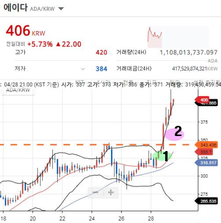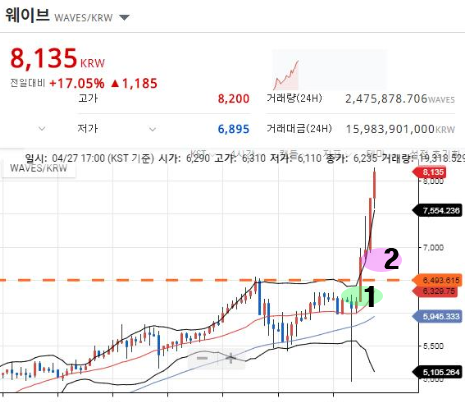 위 차트에서 저항선이 뚫리면서 큰폭으로 상승합니다.매수 타이밍은 1번에 가장 좋으나,저항선을 뚫고 올라갈걸 알고 1번에서 매수하는건 어렵기에 저항선을 뚫고 장대양봉이 쏘는 초입인 2번 매수타이밍으로 좋습니다.
