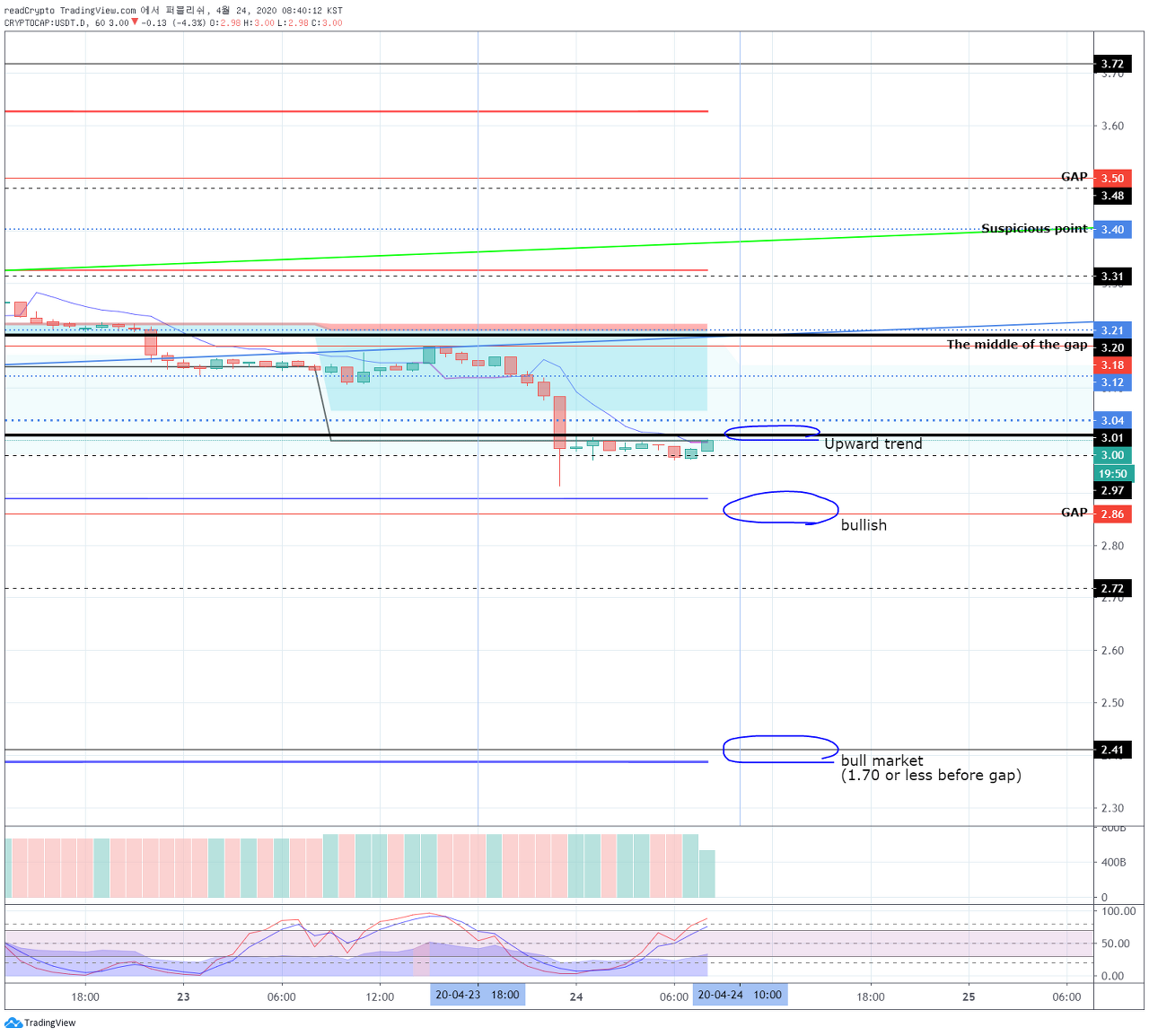 2017년의 불장처럼되기 위해서는 USDT 도미넌스는 2.41 지점 이하로 하락하여야 합니다.