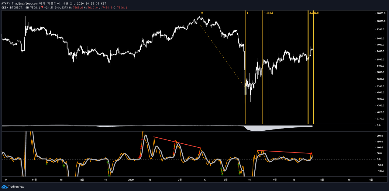 그리고, 피보나치 타임존으로 시간을 확장해보았더니 지금이 잠재적인 분산국면일 가능성이 보입니다.