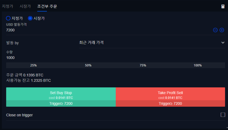 Close on trigger에 체크한다면, Reduce-Only와 마찬가지로 보유한 포지션을 감소시키거나 종료시킬 수만 있고, 포지션을 늘릴 수는 없습니다.