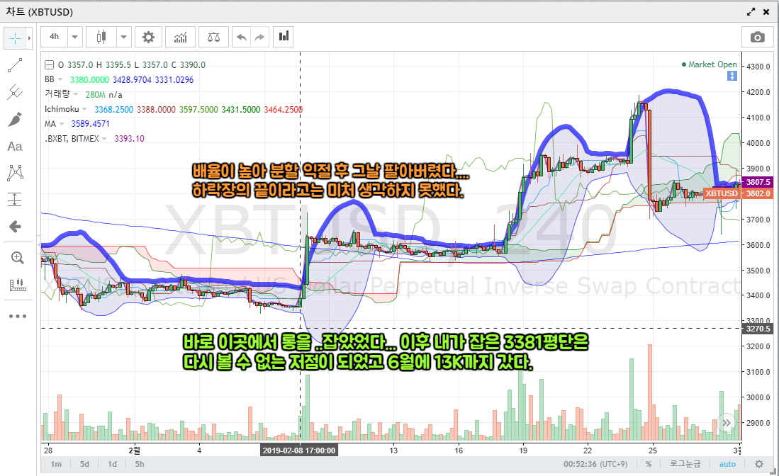 그런데 하락장에 익숙해 있던 저는 .... 3500~3600대 무빙을 견디지 못하고 다시 하락할 것이라는 생각에 전부 팔아버렸습니다. 존버를 했다면 13K 위에서 팔 수 있는 큰 기회였죠.