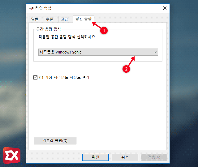 사운드카드 속성의 ①공간 음향 탭을 클릭한 다음 나오는 ②공간 음향 형식 옵션에서 헤드폰용 Windows Sonic 또는 Dolby Atmos for Headphones 중 하나를 선택하면 7.1 가상 서라운드 사운드 켜기 옵션이 자동으로 적용됩니다.