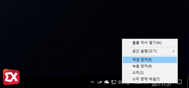 만일 두개 이상의 사운드 카드를 사용하고 있거나, 좀더 상세한 옵션 설정을 하고 싶다면 소리 아이콘을 마우스 오른쪽 버튼으로 클릭 후, 재생 장치를 클릭합니다.
