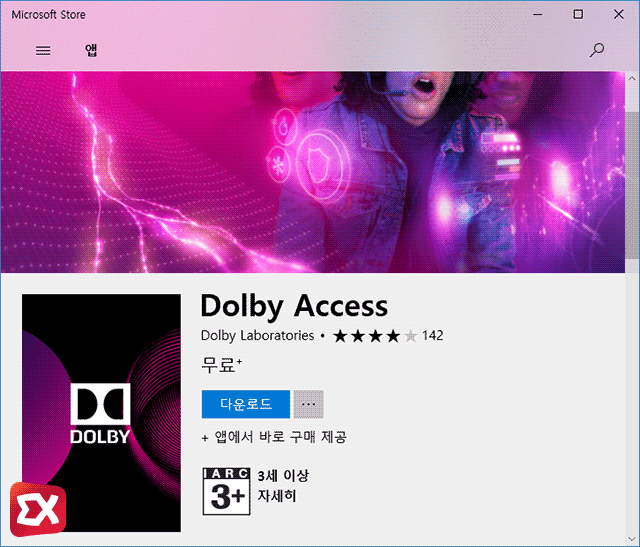 공간 음향에서 돌비 애트모스를 선택했다면 자동으로 윈도우 스토어의 Dolby Access 앱이 팝업되며 앱을 설치해야 공간 음향 옵션의 돌비 애트모스를 설정 할 수 있습니다.